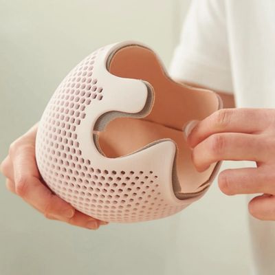 The helmet has two separate liners—front and back—attached with Velcro inside.